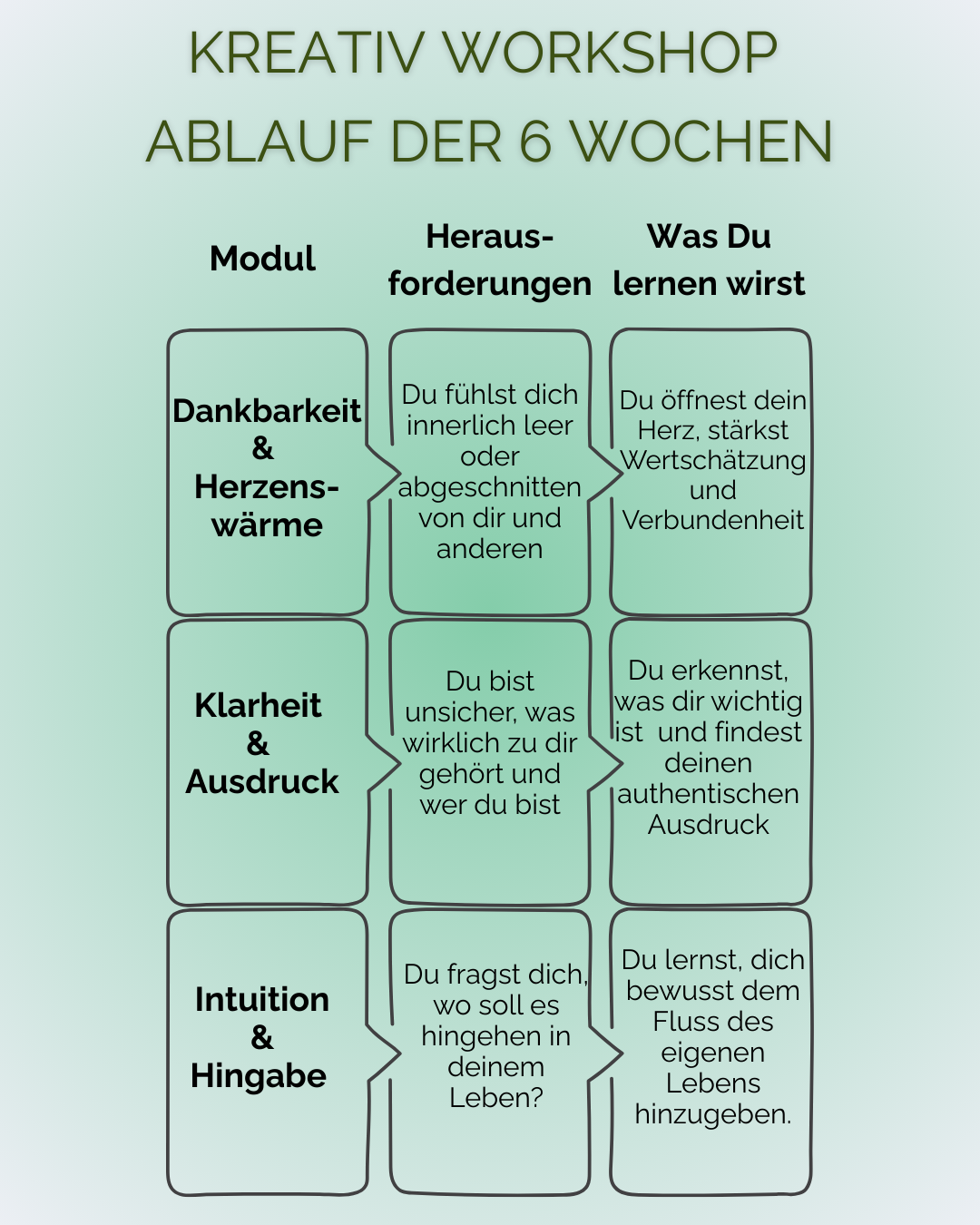 - Du reflektierst dich selbst durch gezielte Übungen, arbeitest mit Farben und Formen und entwickelst Werkzeuge, die dich auch nach den 6 Wochen im Alltag unterstützen.